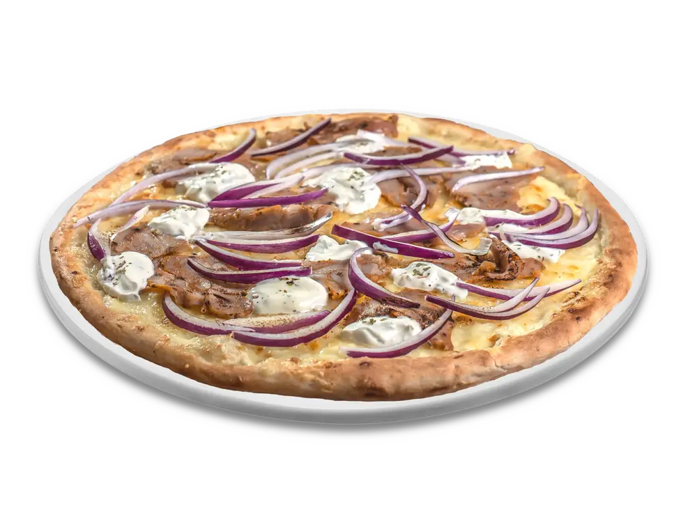 Frischer Teig, Creme Fraiche, echter Käse, Zwiebeln, Hähnchen Dönerfleisch